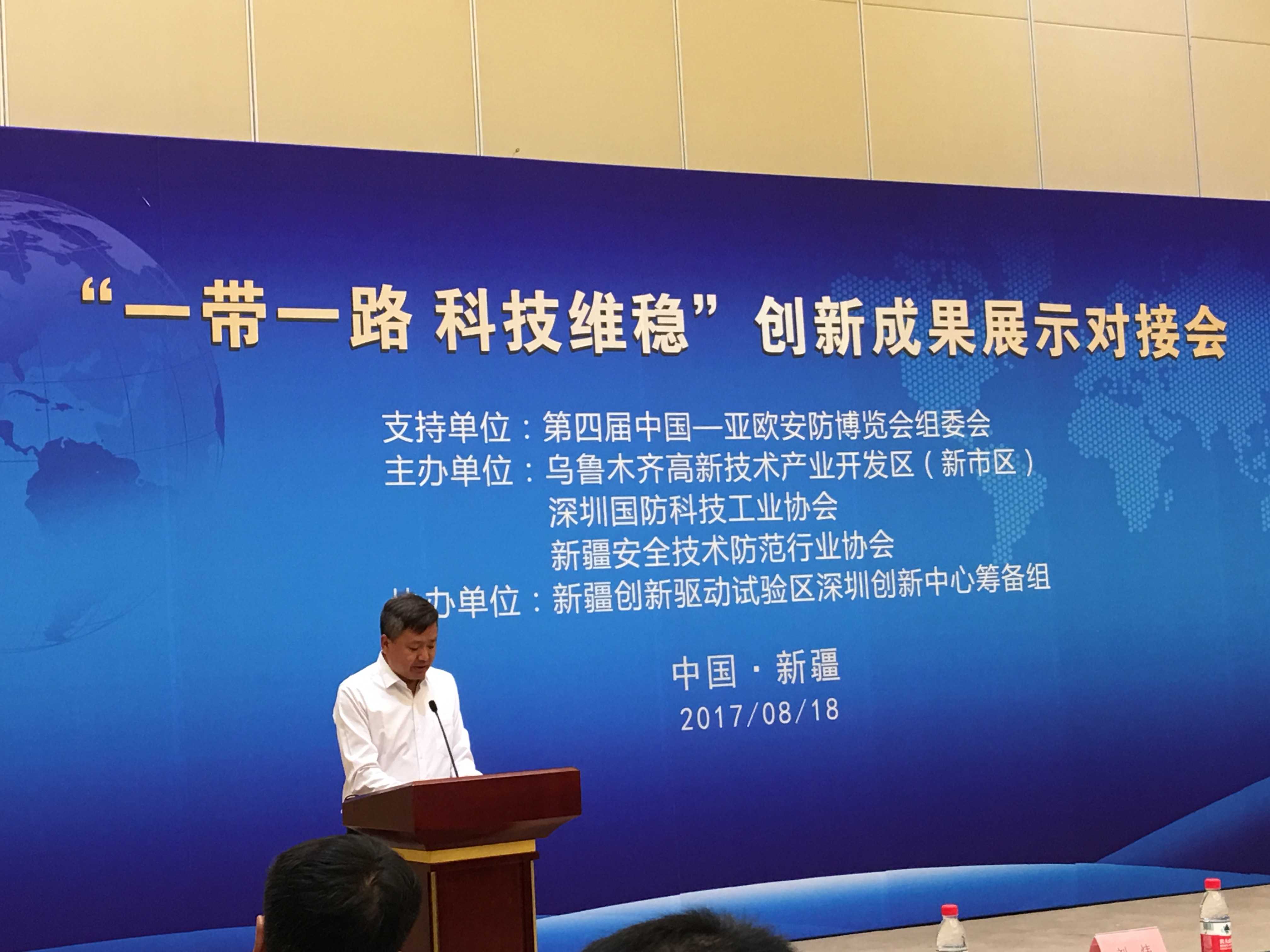 展会期间,乌鲁木齐高新区(新市区)政府协同深圳国防科技工业协会、新疆安防协会,于8月18日在会展中心5楼多功能厅联合举办了“一带一路·科技维稳”创新成果展示对接会。自治区政法委、公安厅及监狱局等领导、深圳对口援疆前方指挥部领导、陆军边海防学院乌鲁木齐校区相关专家、乌鲁木齐公安政法系统相关主管部门以及行业协会、深圳22家军民融合高新技术企业负责人等150多人进行了交流对接。米兰·(milan)科技董事长刘骏先生代表深圳22家企业向参会领导发言表态,将持续向反恐一线提供高、精、尖、端反恐技术及装备产品并全力配合国家及自治区政府打好反恐维稳人防及技防的“组合拳”,夺取反恐维稳斗争的全面胜利。